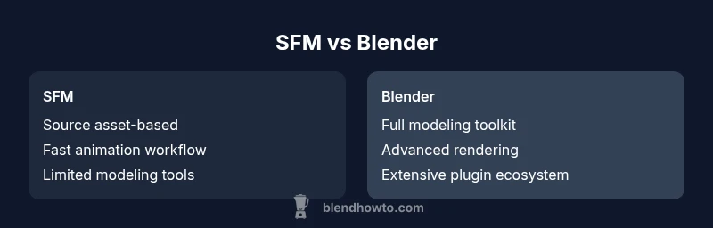 SFM stands for Source Filmmaker; it is designed for rapid animation using Source engine assets. Blender is a comprehensive 3D package capable of modeling, rigging, animation, and rendering. The main difference is scope: SFM is pipeline-lean for Source content, while Blender supports end-to-end workflows.