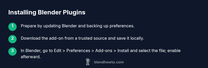 Blender plugins, also called add-ons, are small Python modules that extend Blender’s core capabilities. They can automate repetitive tasks, add new import/export formats, or provide advanced modeling, shading, or animation tools. Understanding where to install Blender plugins is the first step to leveraging their power without breaking your setup. According to BlendHowTo, choosing add-ons from reputable sources reduces compatibility surprises and keeps your projects stable. Add-ons typically integrate into Blender’s interface as new panels, operators, or shortcuts, appearing in the 3D View, Shader Editor, or Timeline, depending on their function. Because plugins are scripts, they share Blender’s philosophy of extensibility: you can tailor the toolkit to your workflow without altering Blender’s base code. The key is to treat plugins as enhancements, not dependencies; install only what you will use and keep a clean, organized workspace to avoid clutter and performance hits.