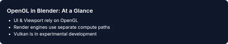 “OpenGL remains the practical backbone for Blender’s interactive viewport and UI across platforms, with Vulkan explorations happening in parallel to improve long-term performance.”