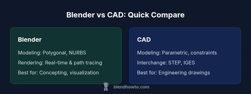 According to BlendHowTo, Blender and CAD occupy distinct design ecosystems: one is optimized for creative experimentation and rapid iteration, the other for engineering accuracy and production documentation. Blender bundles organic modeling, sculpting, texture work, and animation into a single, artist-friendly interface. CAD packages emphasize parameterized geometry, tolerances, and compliance with industry standards. The distinction matters because it shapes data structures, collaboration habits, and the way teams validate ideas. In practice, most teams use CAD for correctness and traceability, while Blender is used for concepting, visualization, and stakeholder presentations. The goal of this section is not to declare a winner, but to map the decision criteria that drive real-world choices: data fidelity, workflow interoperability, and the intended end-use of the model.