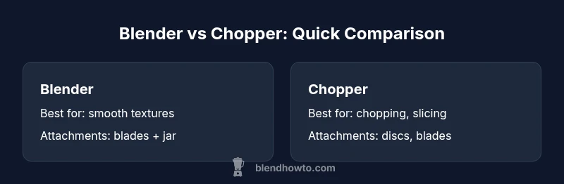 According to BlendHowTo, the core distinction between a blender and a chopper is not only the blade shape but the intended texture outcome. A blender's blades are optimized for circulating ingredients with high-speed blades to create smooth emulsions, sauces, and purees. In contrast, a chopper (often labeled a food processor) uses wider, more rigid discs and a bowl's geometry to chop, shred, or knead, producing chunky to fine-textured results depending on settings and time. This fundamental difference shapes how you approach recipes, cleaning, and attachments. Understanding it helps you avoid buying one tool twice and can guide you toward a more efficient kitchen setup. In practice, most home cooks find that a blender handles liquids and soft ingredients with ease, while a chopper excels at bulk chopping and dough tasks that require a stable, controlled texture.
