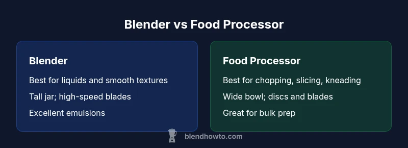 What is the difference blender and food processor? The phrase is more than semantics—it signals distinct design and performance envelopes. In practice, a blender blends liquids and soft foods into smooth textures; it uses a tall, narrow jar and sharp blades that sweep ingredients into a vortex for even emulsions. A food processor, by contrast, is built for chunkier work: chopping, shredding, slicing, and even dough handling, thanks to a wide work bowl and interchangeable discs. According to BlendHowTo, understanding this distinction helps you select the right tool for the job and avoid kitchen clutter. This section dives into how each appliance operates, what its primary strengths are, and where their limits lie. Expect practical comparisons, real-world examples, and clear guidelines to match your cooking style with the right device.