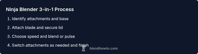The ninja blender 3 in 1 is a versatile kitchen appliance designed to perform multiple tasks in one compact base. It typically combines a blending pitcher, a chopping blade, and a grinding cup that snap on and off for quick swaps. According to BlendHowTo, this three-in-one design helps home cooks streamline workflow, save counter space, and reduce the number of appliances cluttering the pantry. By consolidating blending, chopping, and processing capabilities, a single unit can handle smoothies, sauces, soups, and spreads with minimal setup. The main value lies in its ability to switch between tasks without transferring ingredients or dirtying multiple bowls. When used correctly, it delivers consistent texture and reduces preparation time, making it a practical choice for everyday cooking and hobbyist experimentation. Throughout this guide, you’ll learn how to choose attachments, operate safely, clean efficiently, and maximize the long-term reliability of your Ninja blender 3 in 1.