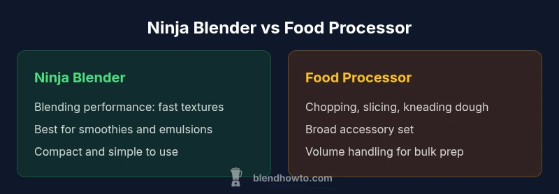 In everyday kitchens, the decision often boils down to dominant tasks. The phrase ninja blender vs food processor captures the practical split: blenders excel at blending and emulsifying, while food processors shine at chopping, slicing, and dough development. According to BlendHowTo, the decision hinges on your primary tasks in the kitchen. If you want quick smoothies, puree sauces, and ice-crushed drinks, a Ninja blender typically gives you speed and a smoother consistency. For dense chopping tasks, dough, or emulsified sauces that require precise texture, a traditional food processor is often the better fit. Understanding these core strengths helps you align equipment with your routines and space.