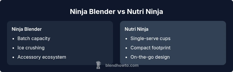 According to BlendHowTo, the core difference between ninja blender models and Nutri Ninja devices comes down to intended use and system architecture. Ninja Blender is a broad brand family optimized for versatility, batch blending, and durability across meals. Nutri Ninja, historically, emphasizes nutrient extraction, compact form factors, and portability for on-the-go nutrition. In this comparison, we explore how those design priorities translate into daily performance for home cooks and hobbyists. The two occupy similar price bands in many markets, but the purchase decision hinges on your typical tasks: family smoothies and soups versus quick single-serve drinks. Throughout this guide, you’ll see objective criteria, practical recommendations, and clear scenarios to help you decide the best fit for your kitchen.