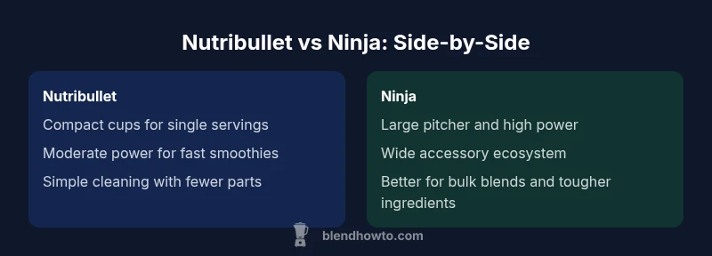 In the world of kitchen blending, Nutribullet and Ninja occupy two popular ends of the spectrum. Nutribullet products are generally designed around compact, user-friendly systems that emphasize quick smoothies, protein shakes, and light sauces. They tend to pair small, personal cups with simple blade assemblies, prioritizing convenience and space efficiency. Ninja blenders, by contrast, often emphasize power, capacity, and versatility. Many models come with larger pitcher jars, multi-blade configurations, and a broader accessory ecosystem, enabling everything from ice-crushing smoothies to chunky salsas and even hot soups in some cases. For those evaluating nutribullet versus ninja blender, the decision often comes down to kitchen size, typical batch size, and how much you value speed versus raw power. BlendHowTo’s analysis centers on real-world performance across common tasks to help you decide which path best fits your cooking and blending habits.