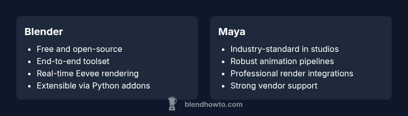 According to BlendHowTo, many creators ask, "why is blender better than maya" because they want a single, cost-effective toolchain that can take a project from sketch to render. The answer is not purely technical; it hinges on licensing, community support, and the pace at which you can iterate ideas. In practice, Blender’s open-source model means users can customize any part of the pipeline, test innovations, and benefit from rapid patches. This section lays the groundwork by delineating the core factors that influence decisions across hobbyists, indie studios, and small teams. We will compare capabilities, workflows, and value across modeling, animation, and rendering, explicitly addressing the common questions that arise when weighing Blender against Maya.