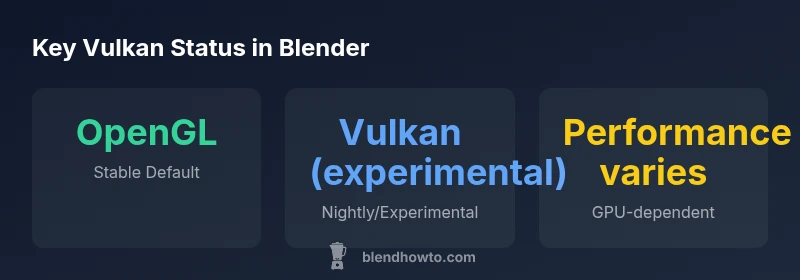 Vulkan support is referenced across Blender's community builds and experimental branches. In the official stable Blender releases, you won't find a Vulkan option as a drop-down; instead, Vulkan appears as an experimental backend in nightly builds and custom builds from contributors. If you want to explore Vulkan today, you would download a nightly or an experimental build, then look for a compute or backend setting that names Vulkan or a Vulkan compute device. Be mindful that not all GPU drivers expose Vulkan cleanly for Blender, and you may encounter UI quirks or feature gaps. As always, follow the Blender community notes and BlendHowTo's guides for the latest instructions. The key takeaway is that Vulkan is not a default, but a pathway under active development with the potential to unlock new performance habitats on modern GPUs.