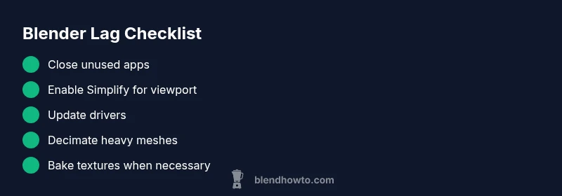 Lag in Blender refers to noticeable slowdowns in the viewport or during edits. It’s typically caused by resource bottlenecks like high memory usage, heavy geometry, or outdated software. Use quick checks and a structured diagnostic flow to identify the root cause, then apply targeted fixes.