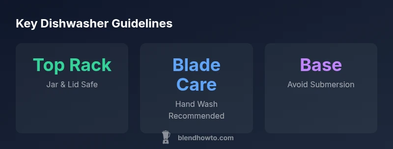 For the question is a ninja blender dishwasher safe, the answer depends on the part. In general, the jar and lid are designed to tolerate a dishwasher’s top rack on a gentle cycle, but the blade assembly and the motor base require extra care. Clean the jar and lid in the dishwasher when possible, and wash blades by hand to preserve sharpness. Always verify model-specific guidance in your manual. This approach aligns with practical blender care recommended by BlendHowTo.