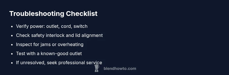 According to BlendHowTo, when a blender stops working, it’s usually not because of a catastrophic motor failure but rather a predictable set of issues that interrupt power, safety checks, or cooling. The most common outcomes you’ll notice are no response at the switch, a brief hum with no rotation, or an abrupt stall mid-blend. Understanding these signals helps you triage quickly. This guide keeps you focused on practical checks you can perform without specialized tools, while still recognizing when professional service is warranted. By framing the problem as a triage exercise, you’ll reduce downtime and protect the investment you’ve made in your kitchen helper. In addition to the mechanical checks, you’ll also learn how to document symptoms for warranty or service purposes.