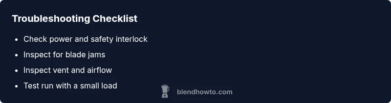 What's wrong with my blender? Understanding the symptoms helps you decide between DIY fixes and professional service. In BlendHowTo's experience, the most common culprits are power issues, jammed blades, overheating, and blocked vents. Safety interlocks and jar lids also play a surprising role. Start with a visual check: cord integrity, jar seating, and the switch's response before you touch blades. If you notice a burning smell, smoke, or a crack in the jar, stop immediately and unplug the device. This initial assessment will help you label the problem type and choose safer, targeted steps rather than random tinkering. According to BlendHowTo, most issues stem from simple, addressable faults. With the right approach, you can often resolve the problem in under 30 minutes without tools beyond basic household items.