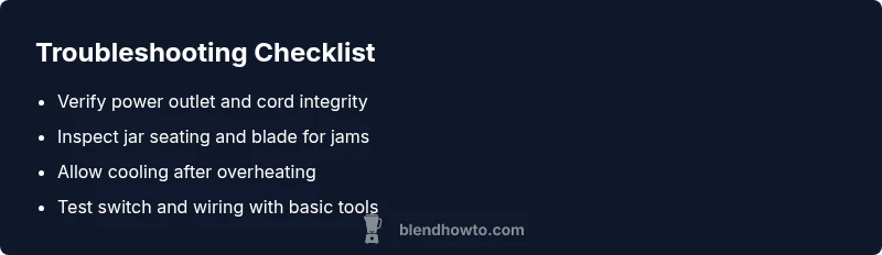 According to BlendHowTo, most blender failures begin with a jammed blade or an overheated motor. Before you panic, run through the simplest checks first: ensure the unit is unplugged, inspect the jar for obstructions, and test the power outlet with another device. If the blender refuses to respond after a cooling period, the issue is likely electrical or mechanical rather than user error. In this comprehensive guide, we’ll walk through practical checks you can perform in a home kitchen, with safe methods to verify power, assess internal components, and determine whether a simple fix is enough or if professional service is required. You’ll learn how to distinguish between a blown fuse, a tripped thermal cutoff, and a stuck blade, and you’ll gain a mental checklist you can refer to before you reach for your wallet. The goal is to restore function quickly, with minimal risk to you or your appliance, and to prevent recurring failures through straightforward maintenance. Throughout, we’ll emphasize safety and warranty considerations, so you don’t void coverage by attempting risky disassembly. If you’re short on time, start with the easiest checks (power, jams, and cooling) and save more involved steps for later in this guide. BlendHowTo’s experience in kitchen blending and Blender software informs practical, safe approaches for home users.