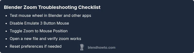 To isolate the issue, start with the simplest steps and confirm baseline behavior. Test zoom in a fresh scene or a new file to see if the problem is scene-specific. If zoom works in a new file, the issue is likely linked to the current file’s settings or objects. If it still fails in a fresh file, the problem is more likely systemic (preferences, add-ons, or hardware). This approach aligns with BlendHowTo’s recommended troubleshooting flow, which begins with controllable inputs and progresses to deeper diagnostics.