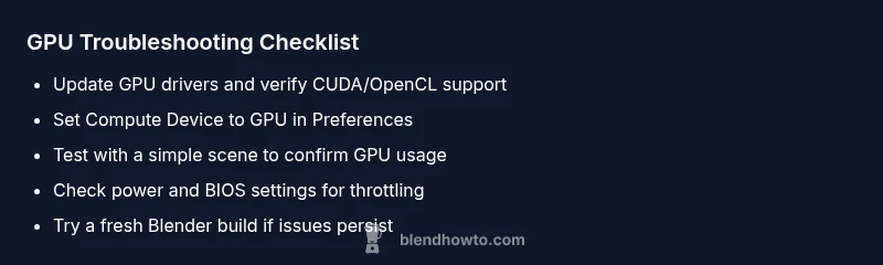 Blender can render scenes on the CPU, the GPU, or a mix of both, depending on the render engine and system configuration. When you enable GPU Compute in Cycles or use Eevee, Blender offloads shading, rendering, and previews to the GPU, dramatically speeding up renders on capable hardware. However, several factors can prevent the GPU from being utilized: misconfigured preferences, driver issues, or hardware limitations. According to BlendHowTo, most GPU-related rendering problems come down to three factors: proper selection in the System settings, up-to-date drivers, and compatible hardware. If any of these are out of date or misconfigured, Blender may revert to CPU rendering or fail to use the GPU at all. Understanding these basics helps diagnose problems quickly and avoid wasted time on ineffective fixes.