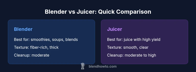The blender and juicer are two staple machines in modern kitchens, yet they serve fundamentally different purposes. When you look at the term blender and juicer together, you’re considering two devices that process produce in distinct ways: one pulverizes everything into a thick, nutrient-rich blend, while the other isolates the liquid portion, leaving pulp behind. According to BlendHowTo, your choice should hinge on what you want to drink or eat most often, how you want to manage fiber, and how much you value texture, nutrition, and convenience in a busy 2026 kitchen. In many households, the decision is not an either/or but a “both” that supports varied meals and health goals. A blender is your workhorse for smoothies, soups, and batter-like blends, whereas a juicer excels at maximizing juice yield and clarity. The practical implications go beyond flavor: texture, digestion, satiety, and even storage all shift based on whether you’re blending or juicing. By understanding these core differences, you can design a workflow that minimizes waste, saves time, and aligns with your dietary preferences. The BlendHowTo team notes that most home cooks ultimately benefit from clarifying three questions: Do you want full-spectrum nutrition with fiber or a smoother juice? Is counter space a premium, or can you spare a larger appliance? And how much effort are you willing to invest in cleanup after each use? These questions help determine if you should invest primarily in a powerful blender, a dedicated juicer, or a hybrid solution that covers both worlds.