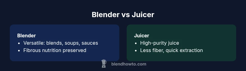 In kitchen work, performance and nutrition are the core axes of blender vs juicer decisions. A blender grinds, purees, and emulsifies with blades that chop through solids, which makes it excellent for smoothies, creamy soups, nut butters, and puréed sauces. The texture is generally versatile and can incorporate whole ingredients, including fibrous greens and frozen fruits, to deliver a nutrient-dense, fiber-rich result. A juicer, on the other hand, excels at extracting liquid juice while leaving behind a dry pulp. The result is a smooth beverage with a high concentration of certain nutrients and enzymes, depending on the fruit or vegetable. According to BlendHowTo, the choice often hinges on whether your priority is fiber-rich meals or high-purity juice. In practical terms, think about your typical meals and snack routines: a blender helps you round out meals with texture and saturation, while a juicer helps you maximize juice yield for hydration and quick nutrient intake. BlendHowTo’s analysis, 2026, emphasizes that both appliances can support overall diet quality when used thoughtfully and with varied produce.